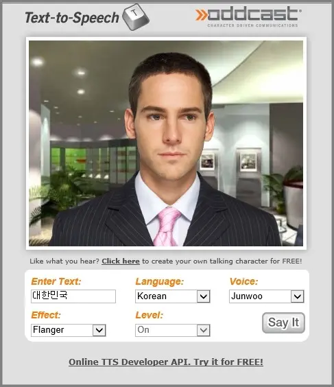 글자를 읽어 주는 사이트를 소개합니다. 심심할 때 가서 놀면 은근히 재밌네요 ㅋㅋ 이렇게 잘 생긴 사람이 나와서 또박또박 잘 읽어줍니다. 한글 말고도 다른 27개국 언어로 다 읽어 준다고 하네요^^ 이펙트도 여러가지 있습니다. 적용해보면 신기해요 ㅋㅋ 보이스도 여자 목소리도 있고 남자 목소리도 있고 선택 가능해요~~