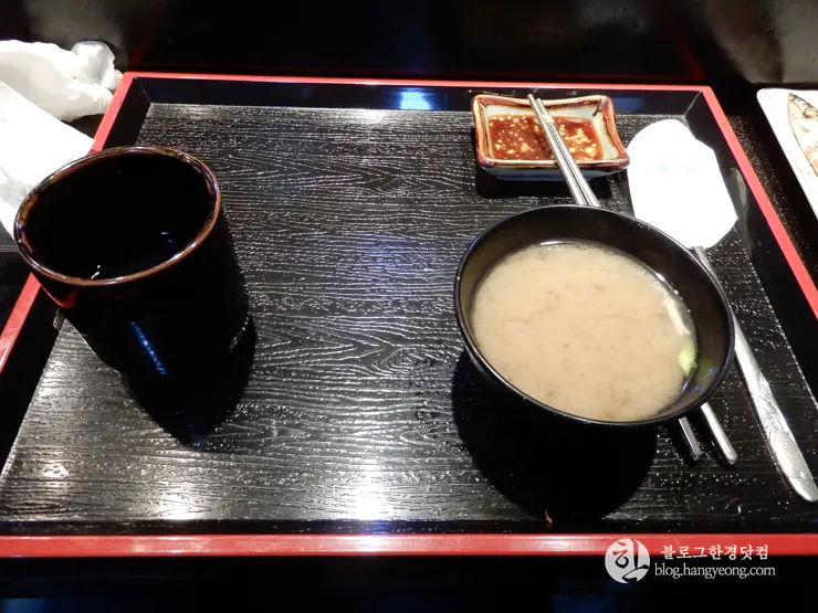 자리에 앉아 주문을 하면 꽁치와 와사비 장, 생강편초무침 등 기본반찬이 세팅이 된다.