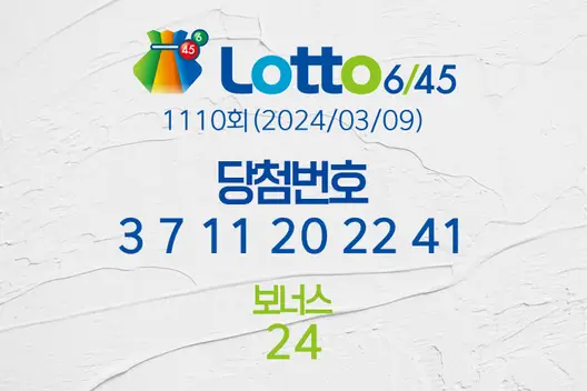 동행복권 로또 6/45 1110회, 추첨일 2024년 03월 09일 (토),의 당첨번호 결과가 발표되고 복권 총 판매액과 당첨금, 1등 배출 복권 판매점 등이 모두 공개됐다. 1110회차 총 로또복권 판매액은 115,083,786,000원이고 로또 복권 당첨 번호는 3, 7, 11, 20, 22, 41 이다. 1등은 로또당첨번호 여섯 개가 모두 일치 해야 당첨이 된다. 2등 보너스 번호는 24이다. 로또당첨번호 중 임의의 다섯 개와 보너스 번호가 일치 하면 2등이다. 이하의 내용에서 당첨결과와 1등 배출점 등을 상세히 다루도록 하겠다.