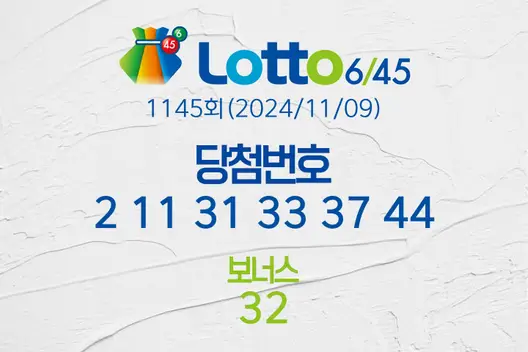 동행복권 로또 6/45 1145회, 추첨일 2024년 11월 09일 (토),의 당첨번호 결과가 발표되고 복권 총 판매액과 당첨금, 1등 배출 복권 판매점 등이 모두 공개됐다. 1145회차 총 로또복권 판매액은 116,115,162,000원이고 로또 복권 당첨 번호는 2, 11, 31, 33, 37, 44 이다. 1등은 로또당첨번호 여섯 개가 모두 일치 해야 당첨이 된다. 2등 보너스 번호는 32이다. 로또당첨번호 중 임의의 다섯 개와 보너스 번호가 일치 하면 2등이다. 이하의 내용에서 당첨결과와 1등 배출점 등을 상세히 다루도록 하겠다.