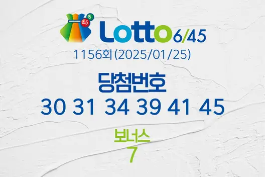 동행복권 로또 6/45 1156회, 추첨일 2025년 01월 25일 (토),의 당첨번호 결과가 발표되고 복권 총 판매액과 당첨금, 1등 배출 복권 판매점 등이 모두 공개됐다. 1156회차 총 로또복권 판매액은 127,643,987,000원이고 로또 복권 당첨 번호는 30, 31, 34, 39, 41, 45 이다. 1등은 로또당첨번호 여섯 개가 모두 일치 해야 당첨이 된다. 2등 보너스 번호는 7이다. 로또당첨번호 중 임의의 다섯 개와 보너스 번호가 일치 하면 2등이다. 이하의 내용에서 당첨결과와 1등 배출점 등을 상세히 다루도록 하겠다.