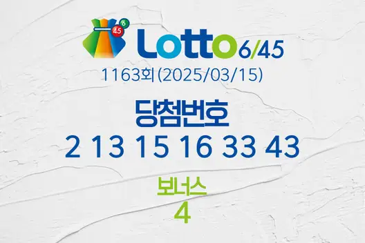 동행복권 로또 6/45 1163회, 추첨일 2025년 03월 15일 (토),의 당첨번호 결과가 발표되고 복권 총 판매액과 당첨금, 1등 배출 복권 판매점 등이 모두 공개됐다. 1163회차 총 로또복권 판매액은 122,246,316,000원이고 로또 복권 당첨 번호는 2, 13, 15, 16, 33, 43 이다. 1등은 로또당첨번호 여섯 개가 모두 일치 해야 당첨이 된다. 2등 보너스 번호는 4이다. 로또당첨번호 중 임의의 다섯 개와 보너스 번호가 일치 하면 2등이다. 이하의 내용에서 당첨결과와 1등 배출점 등을 상세히 다루도록 하겠다.