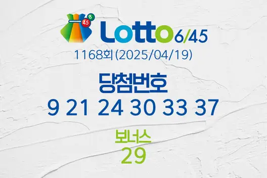 동행복권 로또 6/45 1168회, 추첨일 2025년 04월 19일 (토),의 당첨번호 결과가 발표되고 복권 총 판매액과 당첨금, 1등 배출 복권 판매점 등이 모두 공개됐다. 1168회차 총 로또복권 판매액은 117,811,795,000원이고 로또 복권 당첨 번호는 9, 21, 24, 30, 33, 37 이다. 1등은 로또당첨번호 여섯 개가 모두 일치 해야 당첨이 된다. 2등 보너스 번호는 29이다. 로또당첨번호 중 임의의 다섯 개와 보너스 번호가 일치 하면 2등이다. 이하의 내용에서 당첨결과와 1등 배출점 등을 상세히 다루도록 하겠다.